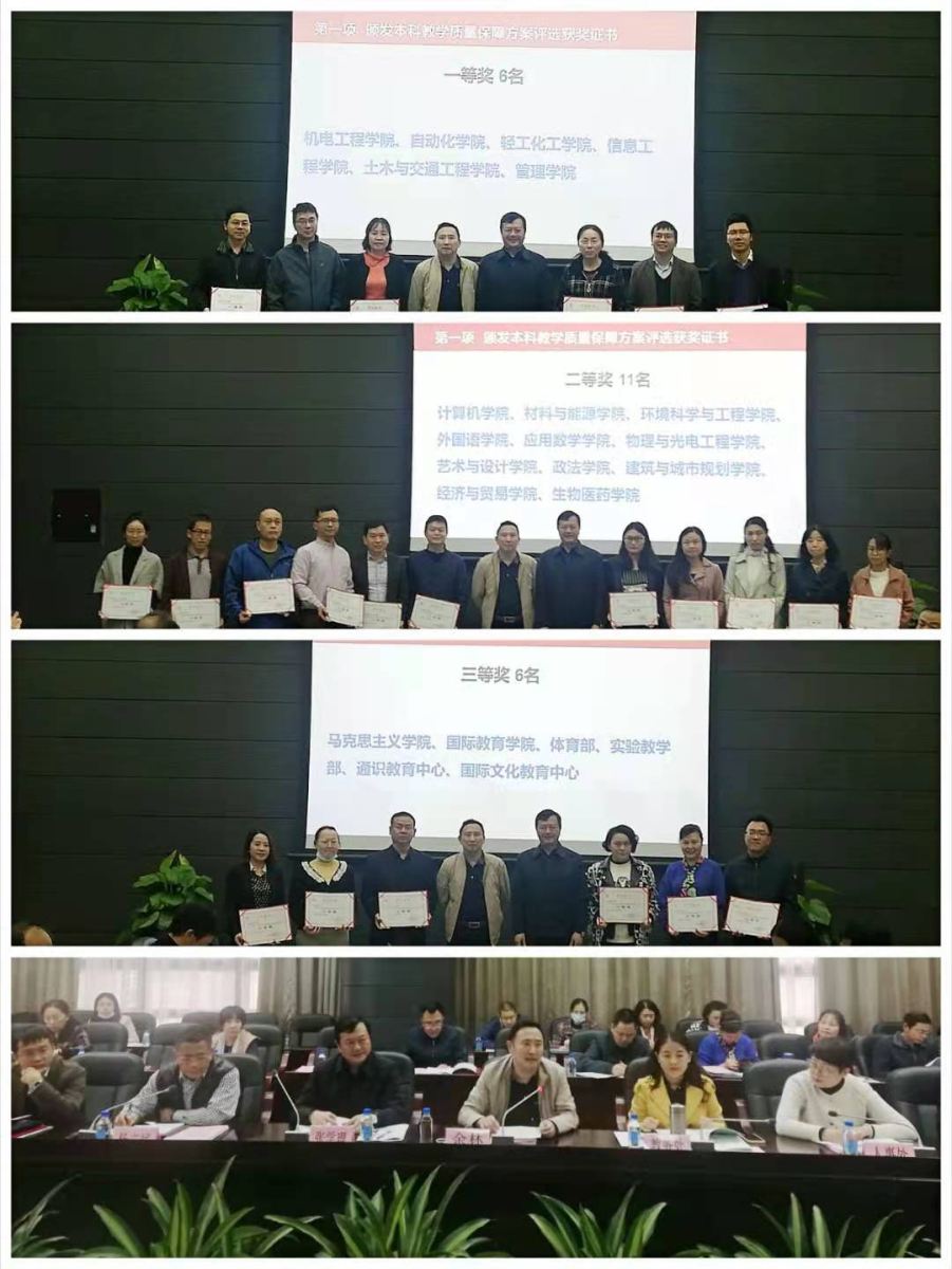 会上杨文斌宣读了《关于公布2020年本科教学质量保障方案评比结果的通知》,余林和张学理为各教学单位颁发了获奖证书并合影。