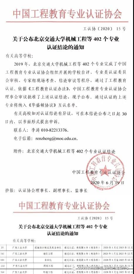 根据中国工程教育专业认证协会发布的《关于公布专业认证结论的通知》(工认协[2020]15号),2019年我校5个专业通过了中国工程教育专业认证,分别为机械设计制造及其自动化、通信工程、自动化、网络工程、环境工程,认证有效期为6年(2020年1月-2025年12月),其中自动化专业在2017年首次专业认证获得通过后,此次参与复评再获通过。